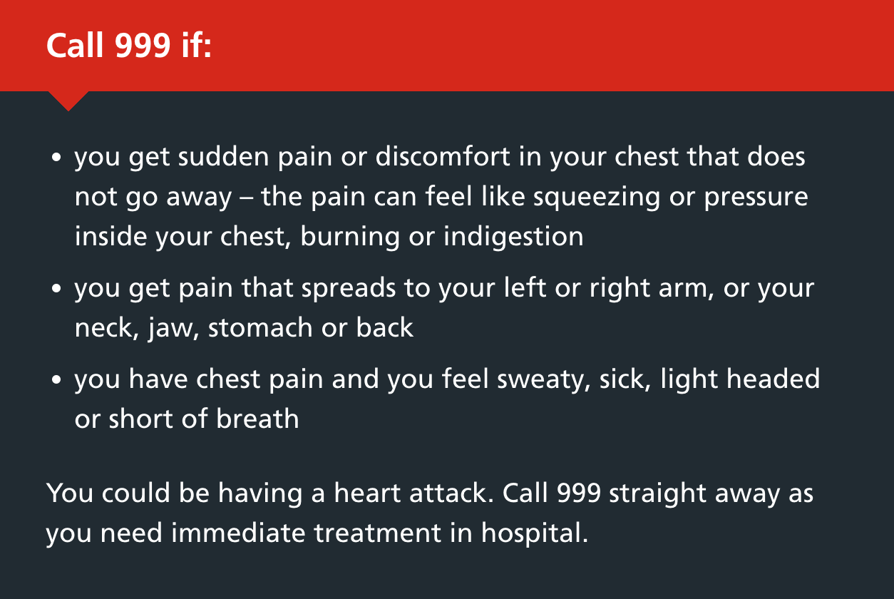 And so to re-iterate the advice from the NHS and American Heart Association, if you experience chest pain or having any symptom that you think may be a heart attack, do not delay calling for medical help as every minute counts.