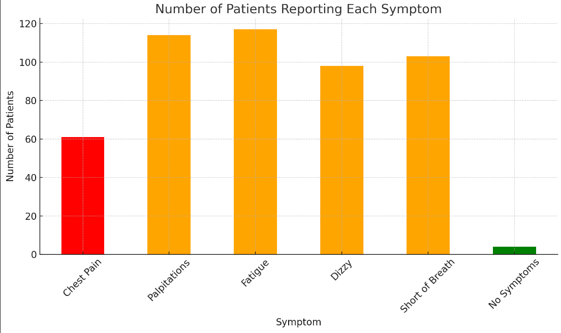 These results have not been formally published yet, but in the AFFU-AW study, we see a similar picture in patients with AF before they undergo catheter ablation. Palpitations, shortness of breath and fatigue are most common. Chest pain is seen, but to a lesser extent. When it is reported it is usually mild, sometimes moderate in severity.