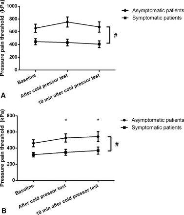 Symptomatic patients had a lower pain threshold when assessed by pressure on the shin and the sternum than asymptomatic patients. Whether this may be due to a pre-existing hypersensitivity or even induced by their AF type was unclear but it warrants further investigation.