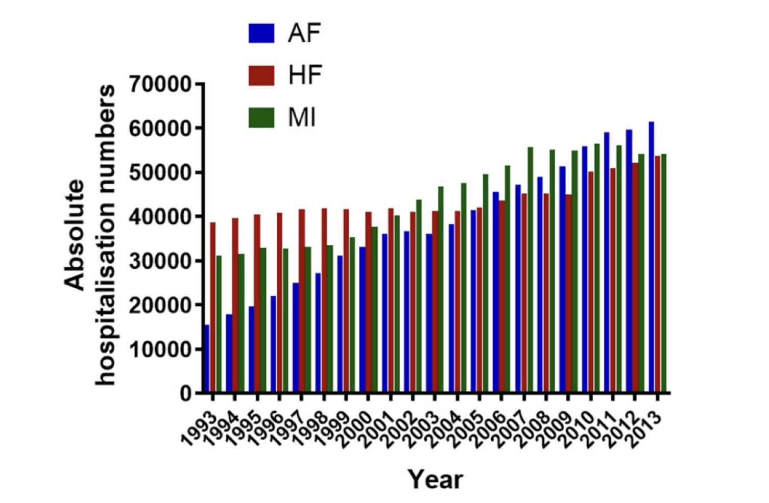 AF is a leading cause of emergency admission. Poorly controlled AF can be debilitating- leading patients to seek emergency attention through A&E. See the bar chart below for just how striking this increasing phenomenon is- it had become the leading cardiac cause of hospitalisation in Australia (prior to Covid).