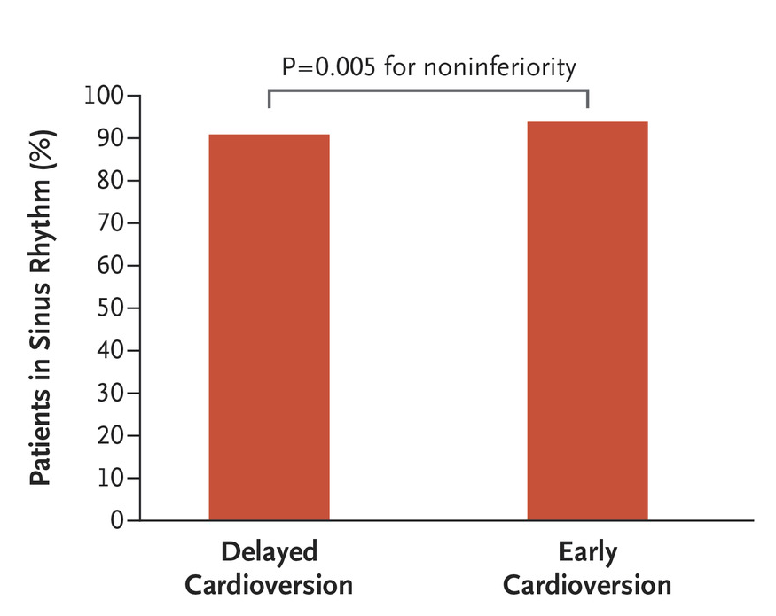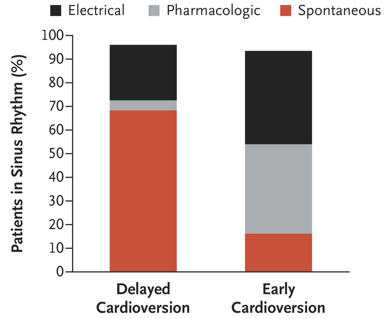 They enrolled 437 patients with new-onset (less than 36 hours) AF who presented to A&E. The headline result was whether you cardiovert them right there and then in A&E versus 2 days later, there was no difference in their heart rhythm outcomes 4 weeks down the line.