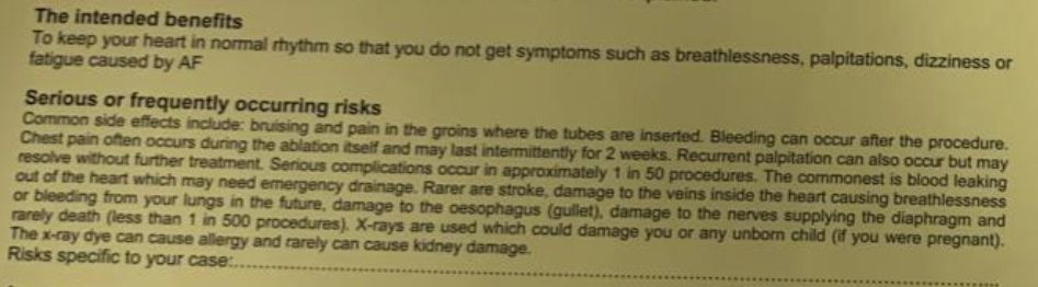 Here is the consent form used at our hospital, St Bartholomew’s Hospital, the largest ablation centre in Europe. The benefits and risks are detailed and the probabilities are based on International and local reviews of our cases (we audit our AF outcomes and complications every couple of months and discuss them as a group in a non-judgemental manner.)