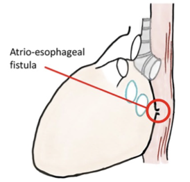 The left atrium sits adjacent to the oesophagus- the food pipe. The walls touching. If the procedure's energy inadvertently affects the oesophagus, it can potentially lead to the formation of an oesophageal fistula, which is an abnormal connection between the oesophagus and another structure, in this case, the heart. This isn’t an immediate event- it’s not poking through the back wall of the heart, it occurs by sustained irritation of the back wall of the atrium and the front wall of the oesophagus so a connection erodes over time- days to weeks. The risk is then of blood leaking into the foodpipe or air from the foodpipe entering the heart and blood circulation causing complications.