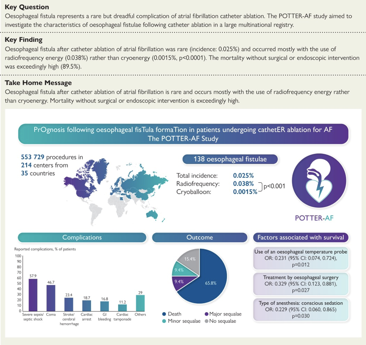 Tilz RR, Schmidt V, Pürerfellner H, Maury P, Chun KJ, Martinek M, Sohns C, Schmidt B, Mandel F, Gandjbakhch E, Laredo M, Gunawardene MA, Willems S, Beiert T, Borlich M, Iden L, Füting A, Spittler R, Gaspar T, Richter S, Schade A, Kuniss M, Neumann T, Francke A, Wunderlich C, Shin DI, Grosse Meininghaus D, Foresti M, Bonsels M, Reek D, Wiegand U, Bauer A, Metzner A, Eckardt L, Popescu SȘ, Krahnefeld O, Sticherling C, Kühne M, Nguyen DQ, Roten L, Saguner AM, Linz D, van der Voort P, Mulder BA, Vijgen J, Almorad A, Guenancia C, Fauchier L, Boveda S, De Greef Y, Da Costa A, Jais P, Derval N, Milhem A, Jesel L, Garcia R, Poty H, Khoueiry Z, Seitz J, Laborderie J, Mechulan A, Brigadeau F, Zhao A, Saludas Y, Piot O, Ahluwalia N, Martin C, Chen J, Antolic B, Leventopoulos G, Özcan EE, Yorgun H, Cay S, Yalin K, Botros MS, Mahmoud AT, Jędrzejczyk-Patej E, Inaba O, Okumura K, Ejima K, Khakpour H, Boyle N, Catanzaro JN, Reddy V, Mohanty S, Natale A, Blessberger H, Yang B, Stevens I, Sommer P, Veltmann C, Steven D, Vogler J, Kuck KH, Merino JL, Keelani A, Heeger CH. A worldwide survey on incidence, management and prognosis of oesophageal fistula formation following atrial fibrillation catheter ablation: The POTTER-AF study. Eur Heart J. 2023 Apr 16:ehad250. doi: 10.1093/eurheartj/ehad250. Epub ahead of print. PMID: 37062040.