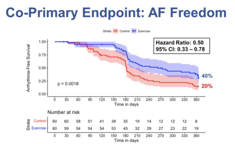 The study involved 120 patients with symptomatic AF. They were randomized to receive an exercise intervention or usual care, with some additional exercise education only. After 12 months, 40% of those in the exercise intervention group were free from AF compared to 20% of patients in the control group. 'Free from AF' means no AF ablation or anti-arrhythmic drug treatments were used either. In addition, those in the exercise group reported lower symptom severity and improved exercise capacity compared to the control group (who weren't prescribed exercise plans).