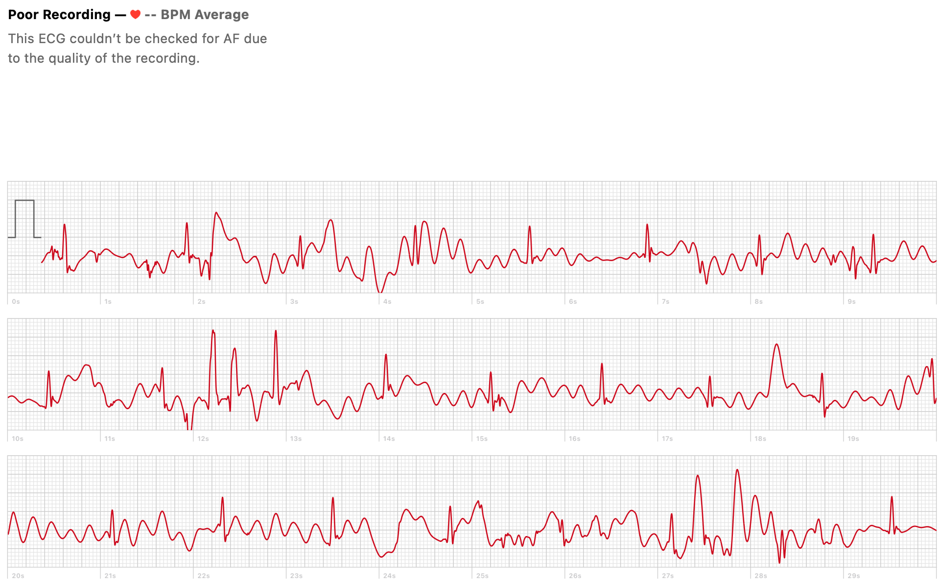 Artefact – This is a very common reason for ECG misinterpretation. If you have tried to record an ECG on a smartwatch, you will know that movement, tremor or instability will result in a really messy tracing- this 'noise' is known as artefact because it does not reflect underlying electrical activity. It can mimic irregular rhythms and the simplest solution is to try and acquire a repeat recording that is clearer.